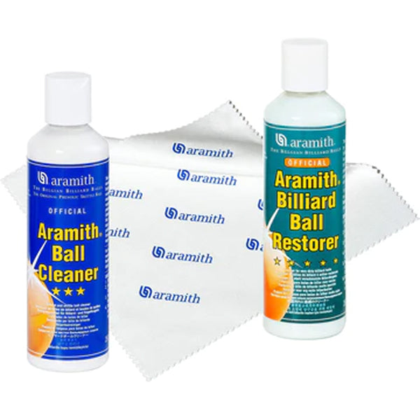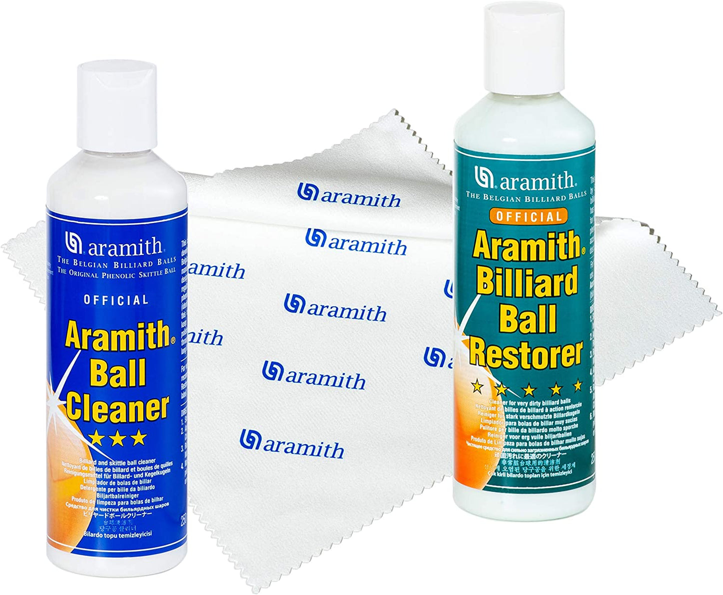 - Bundle includes 3 items: Aramith Billiard Ball Cleaner, Aramith Billiard Ball Restorer 8.4 fl.oz. bottles & Aramith Microfibre Cloth (size: 7 1/8" x 7"), packed in a durable white corrugated box with Aramith logo