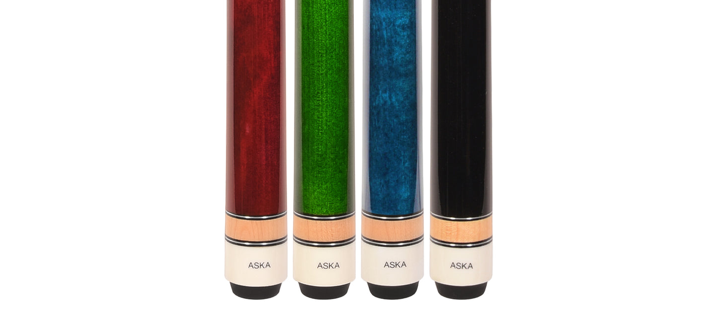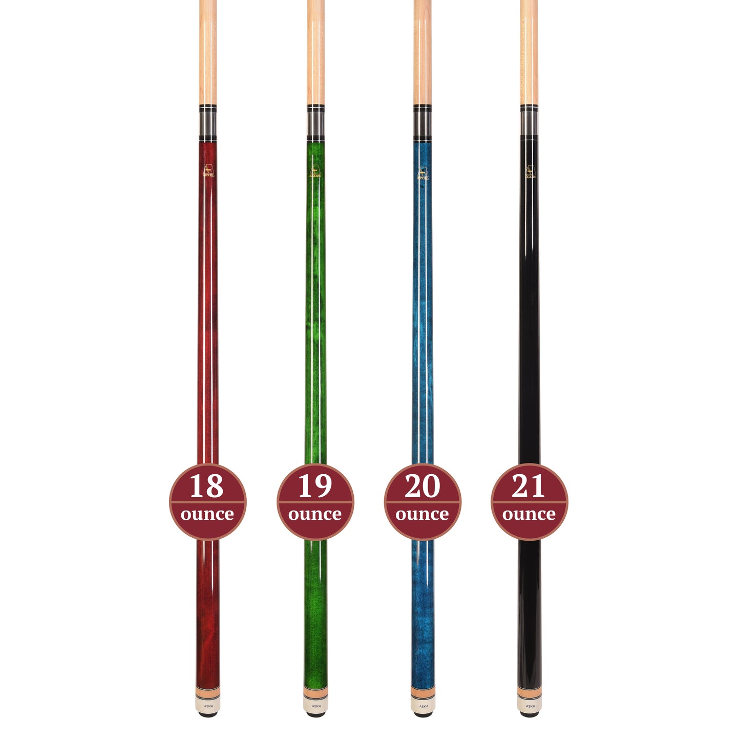 - Wrapless 4(Four) Pool Cue Sticks Set, One Of Each - Black 21-Ounce, Blue 20-Ounce, Green 19-Ounce, Red 18-Ounce.