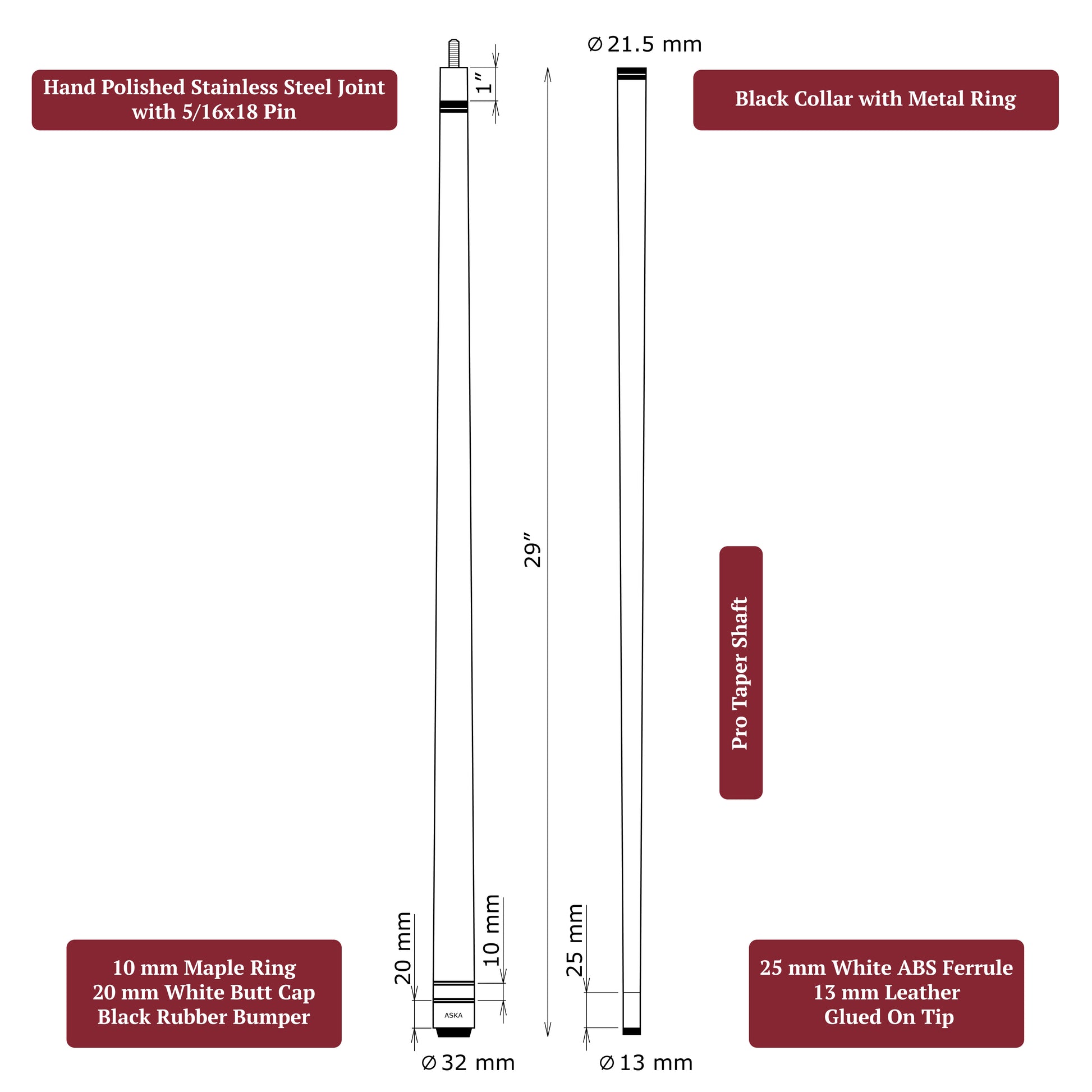 - Canadian Hardrock Maple 29" Shaft. Cue Length is 58" (standard pool cue length)