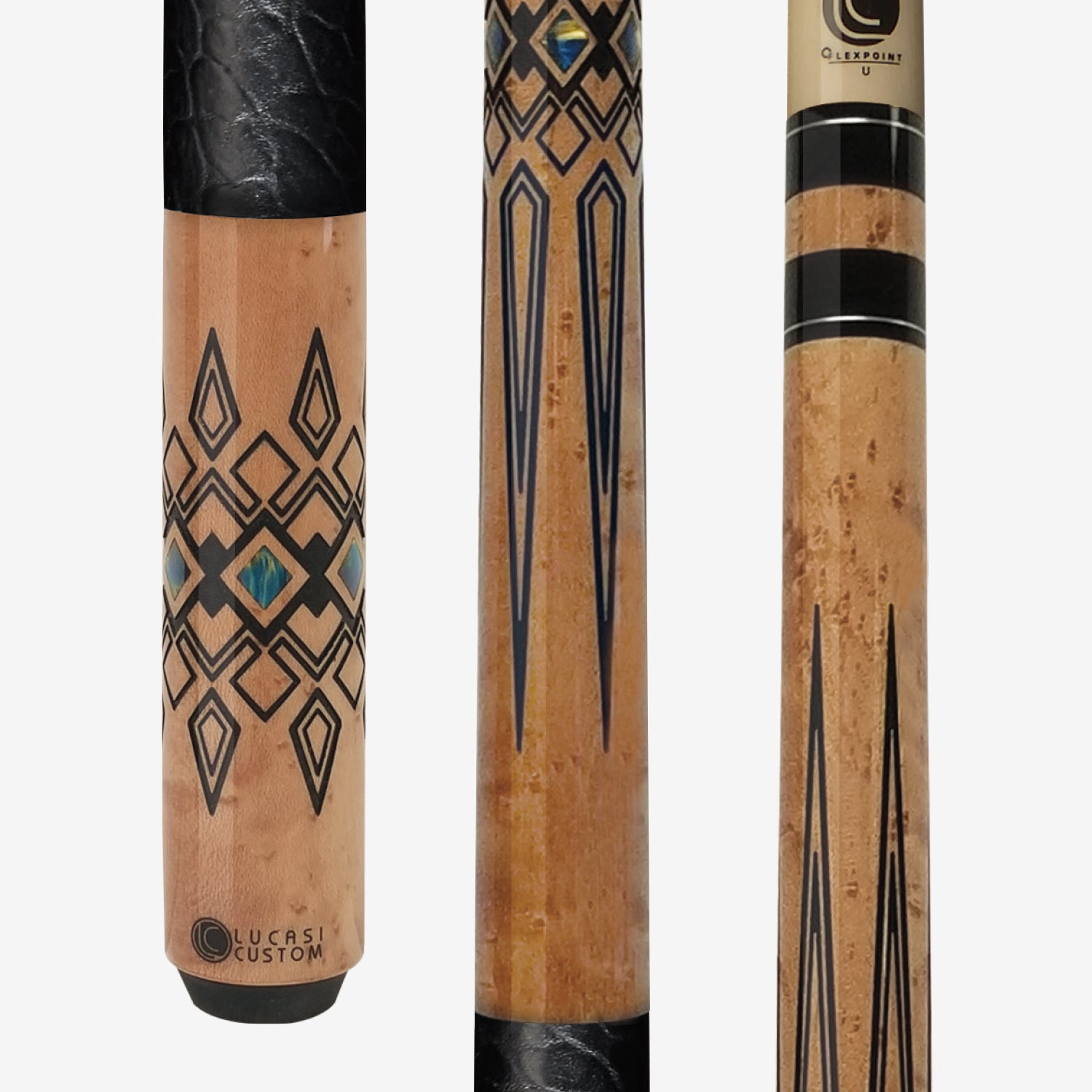 This sleek and simple Lucasi Lux® cue features Antique Birdseye Maple, Laser Etched floating points finished with Ocean Blue poly diamond inlay accents, and Elephant Ear Embossed Genuine Leather Wrap, paired with Lucasi Zero Flexpoint® Solid Core Low Deflection Shaft with Kamui Black Soft Tip & Uni-loc® joint.