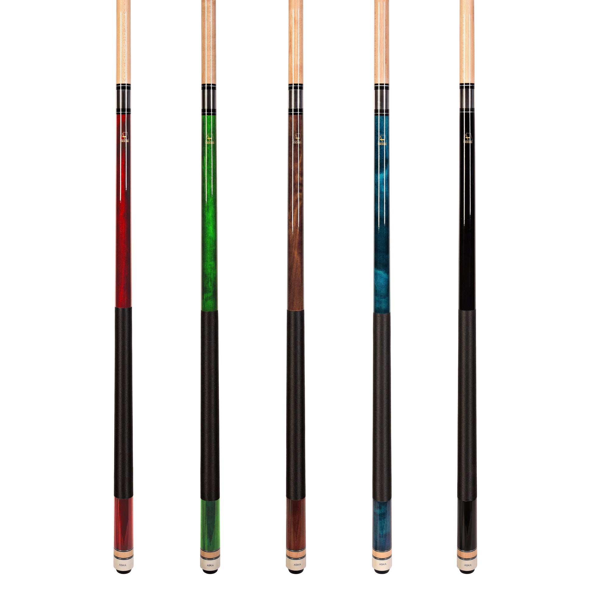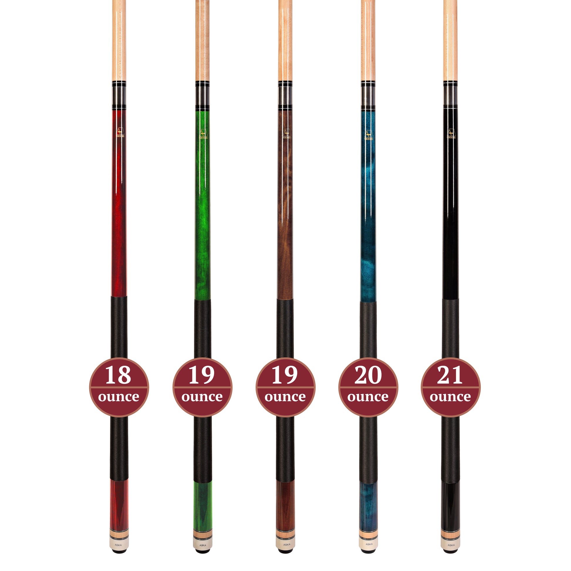 - Set of 5 (Five) pool cue sticks, one of each - Red (18-ounce), Green (19-ounce), Brown (19-ounce), Blue (20-ounce), Black (21-Ounce).