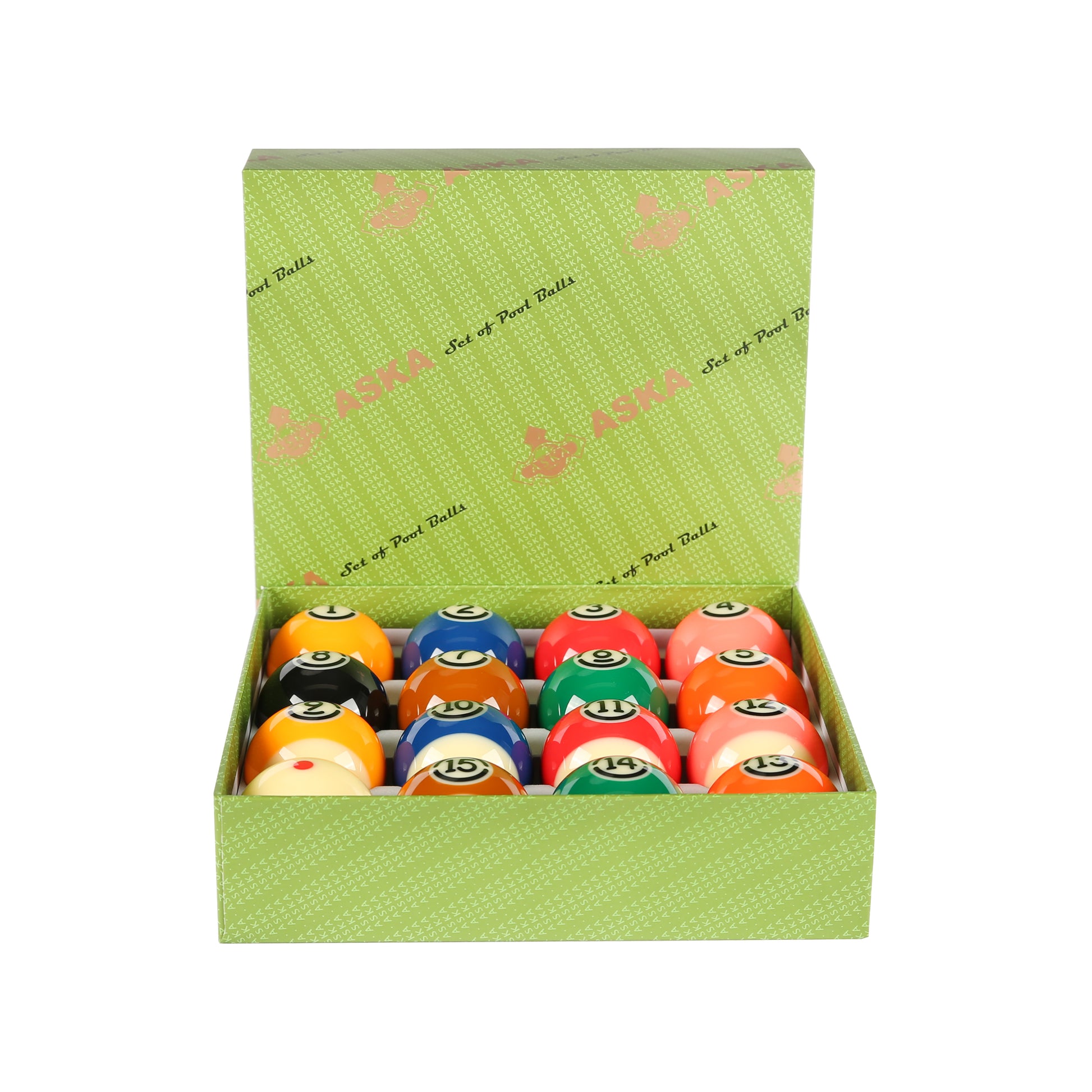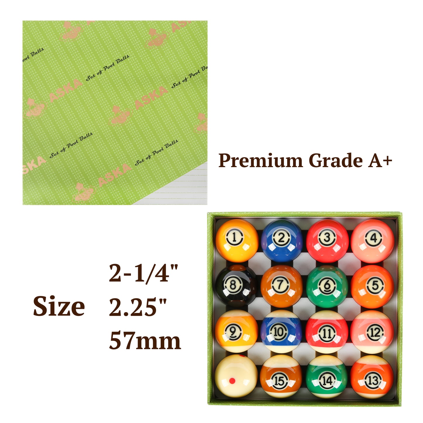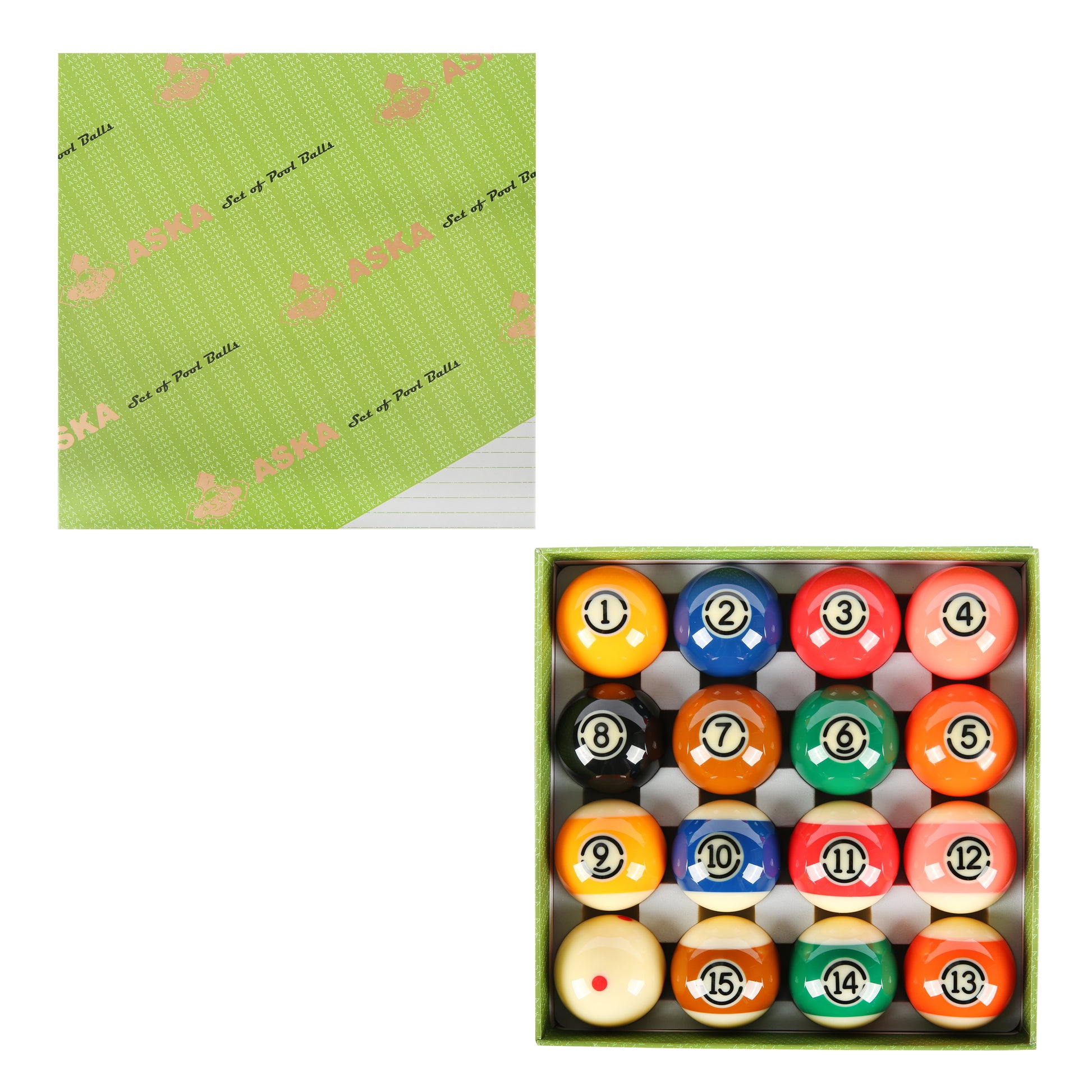Aska Billiards Grade A Pool Boston Numbered Balls Set, 16 Balls Including a Cue Ball, 2 1/4 inch, PB11