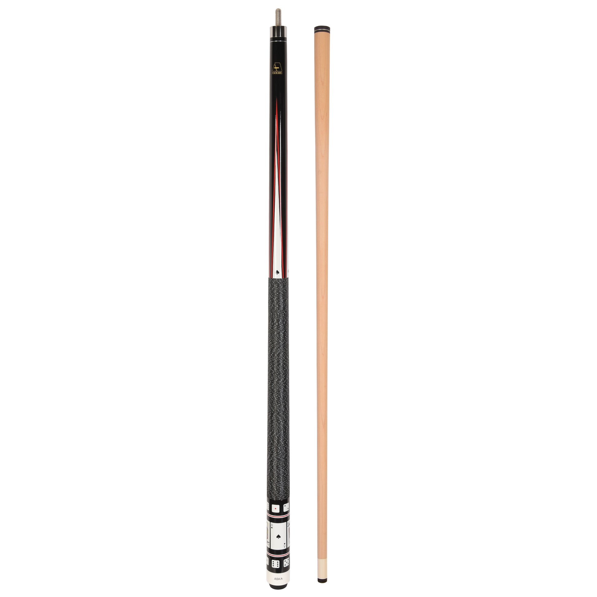 The Aska CD1 pool cue is a classic 58" two-piece model crafted from Canadian hard rock maple and decorated with the signature Spades Royal Family artwork. The butt features a detailed 4-card poker hand with the Jack, Queen, King, and Ace of Spades wrapped around the design.