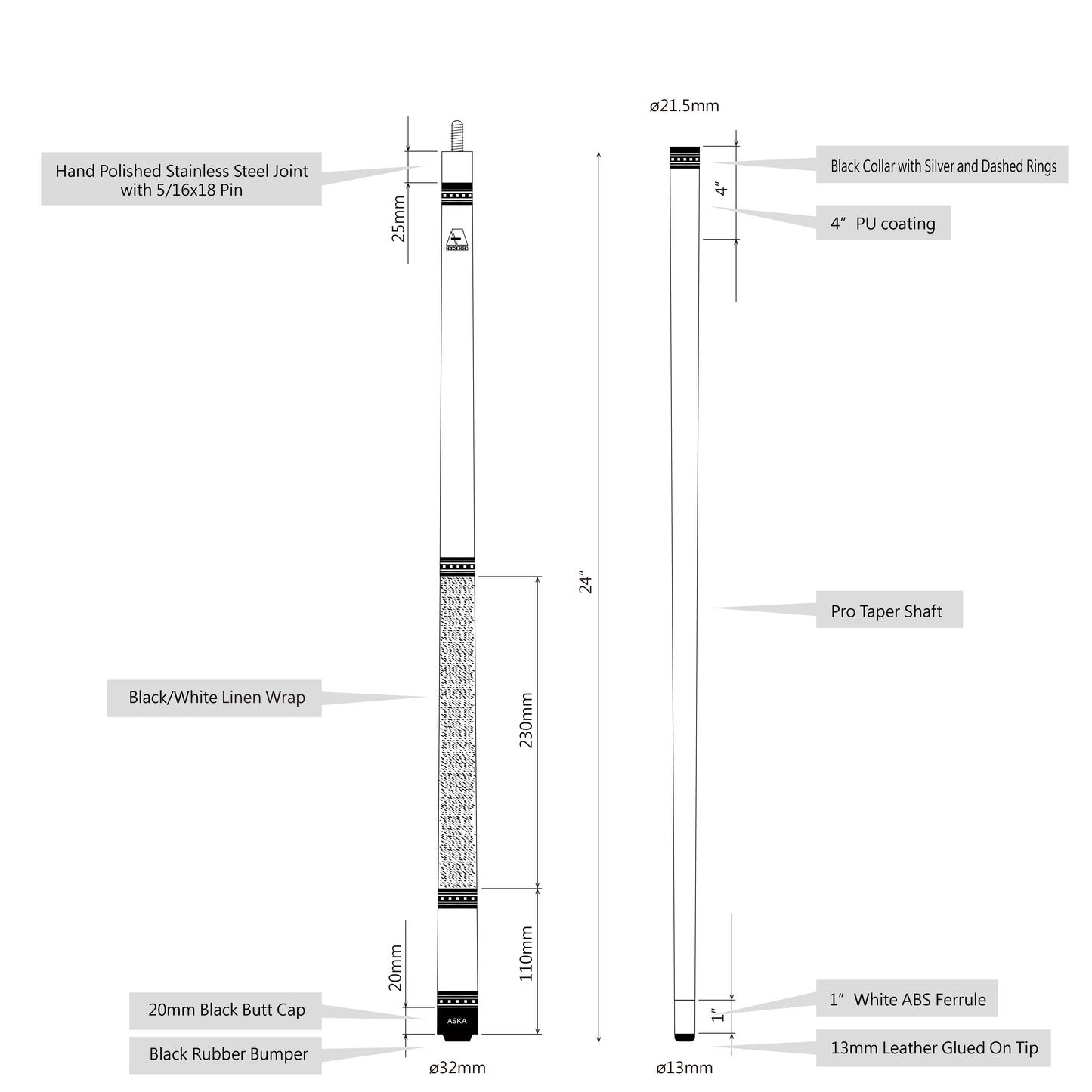 - 5/16x18 joint, Hard Rock Maple Shaft with 13mm Hard Tip. 25mm ABS Ferrule