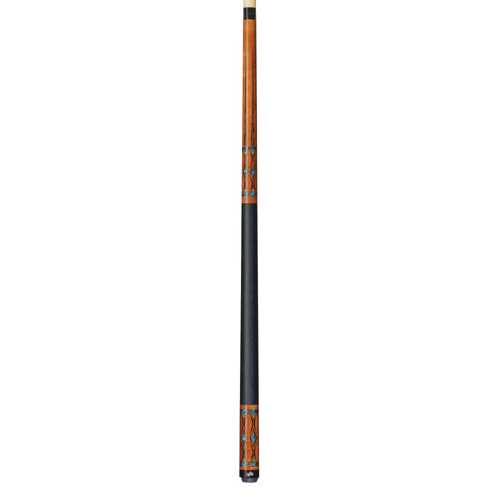 This new Dufferin cue features an antique-stained Canadian Hard Rock Maple forearm and butt with graphic Black Palm points, blue recon diamonds, black genuine leather wrap