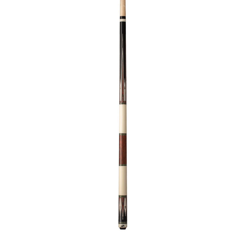 Black with Cocobolo and white accent playing cue. Mother of pearl decal, wrapless handle