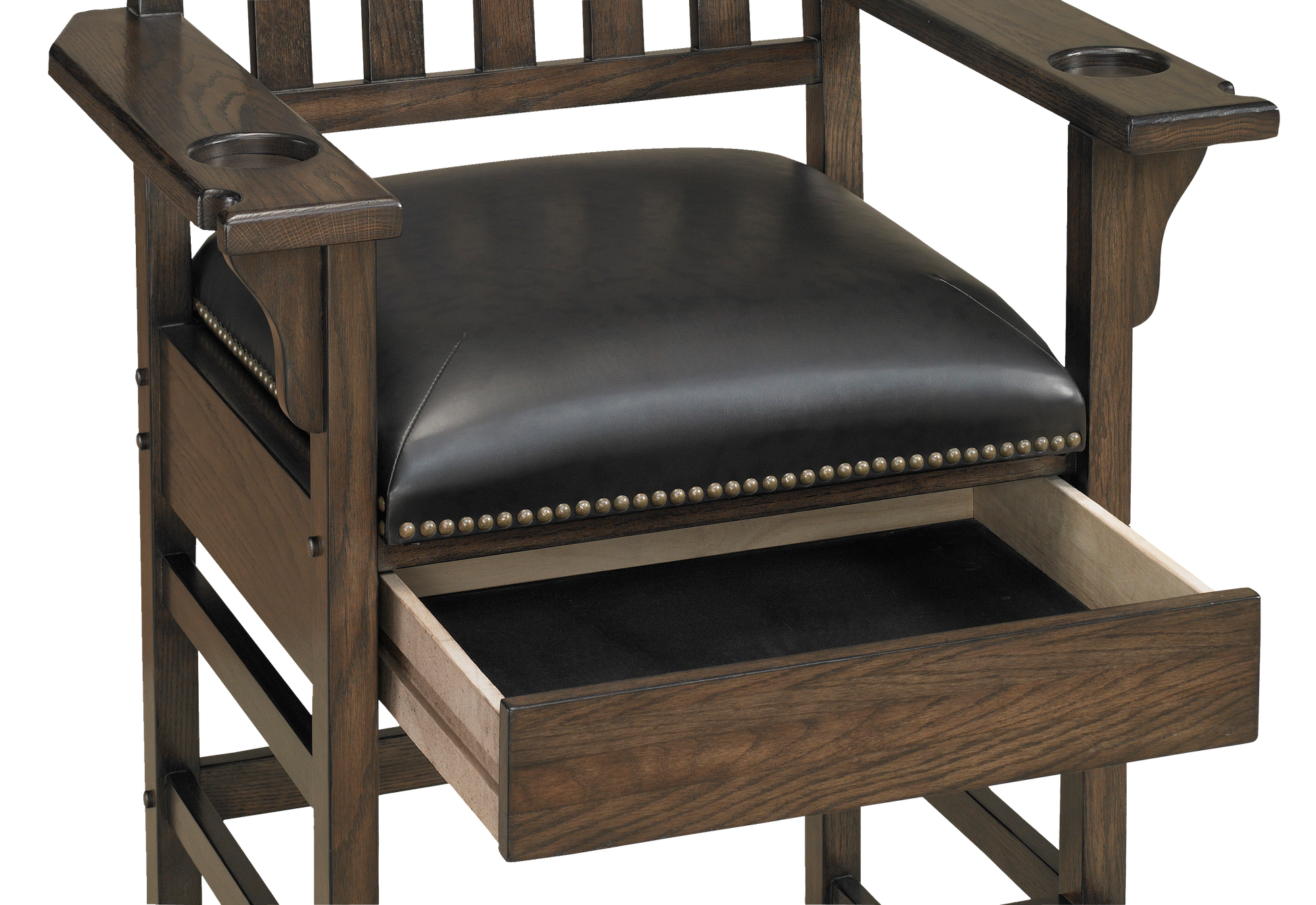 Crafted to reflect its name, keep your eyes on the action with this stately viewing chair. The King Chair touts a wide and slatted back, armrests complete with cup-holders and notches for billiard cues, and a hidden drawer for storage. Available in four different finishes: Black, Glacier, Riverbank, and Suede.