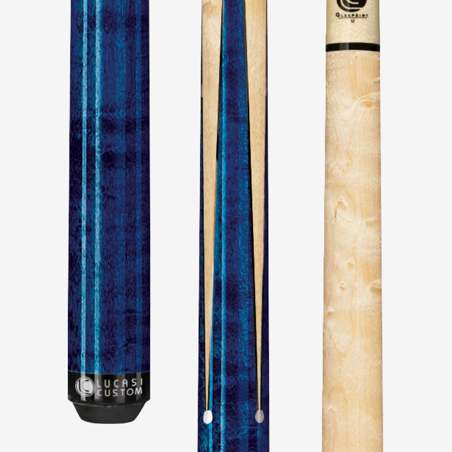 This classically-styled Lucasi Lux® sneaky pete style cue features a four-point Blue stained Birdseye design with mother-of-pearl dot inlays, Birdseye Maple forearm, quick-release Uni-loc® joint, and Zero Flexpoint® Solid Core Low Deflection technology shaft.