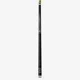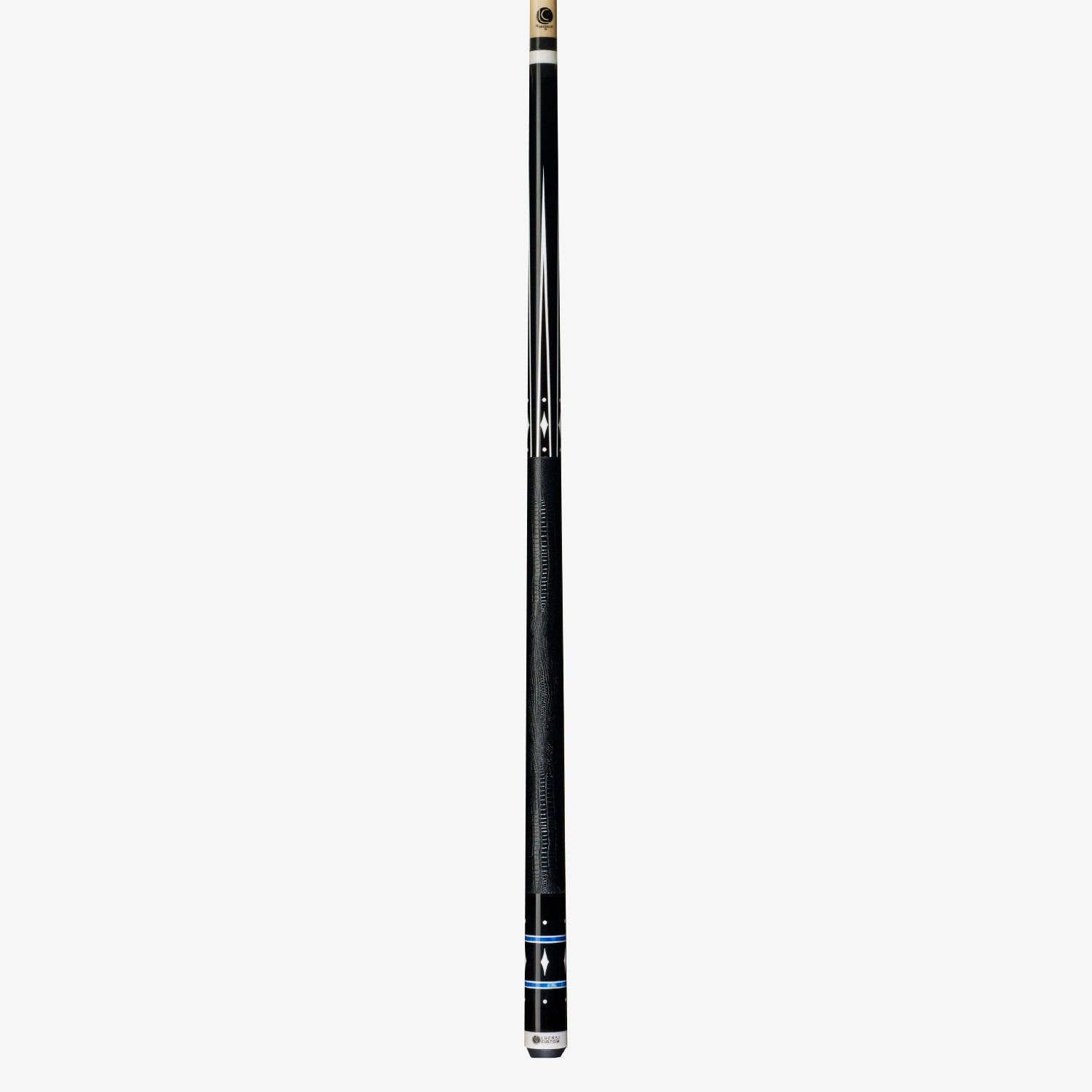 This sleek and simple Lucasi Custom® cue features a Mystic Black maple forearm and butt with imitation bone inlays and sky blue crush velvet poly ring, lizard embossed black leather wrap, custom 3/8 x 10 joint and Zero Flexpoint® Solid Core Low Deflection Technology Shaft