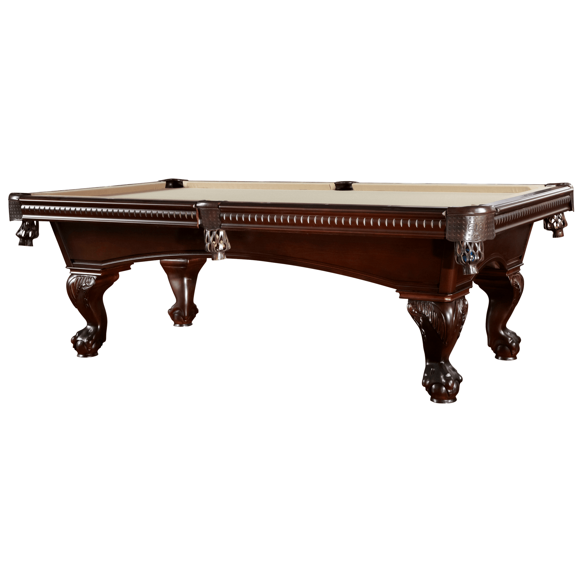 The Marietta Pool Table combines classic elegance with modern craftsmanship to create a stunning centerpiece for any game room. Its traditional claw-and-ball feet, fleur-de-lis leather pockets, and uniquely patterned rails evoke a sense of timeless charm. White molded pearlized diamond rail sights add sophistication, while the striking Sierra stain enhances its visual appeal. Crafted from American Poplar hardwood with reinforced construction, including two cross members and two center beams, this table ensures stability and durability for years to come. Designed for optimal performance, it features K66 premier cushion rubber and custom-tailored leather shield pockets. Whether in a cozy home setting or a bustling game room, the Marietta Pool Table is sure to impress.