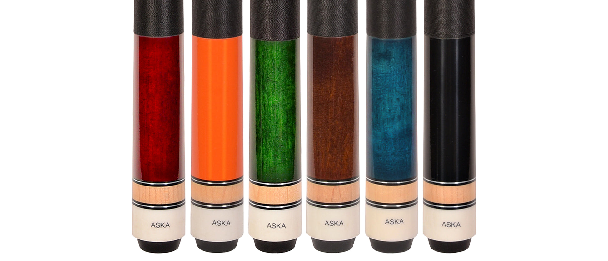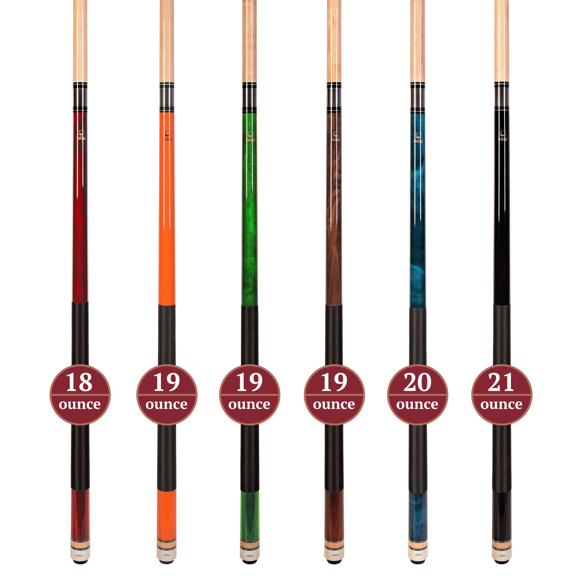 - 6(Six) Pool Cue Sticks Set, One of Each - Black 21-Ounce, Blue 20-Ounce, Brown 19-Ounce, Green 19-Ounce, Red 18-Ounce, Orange 19-Ounce