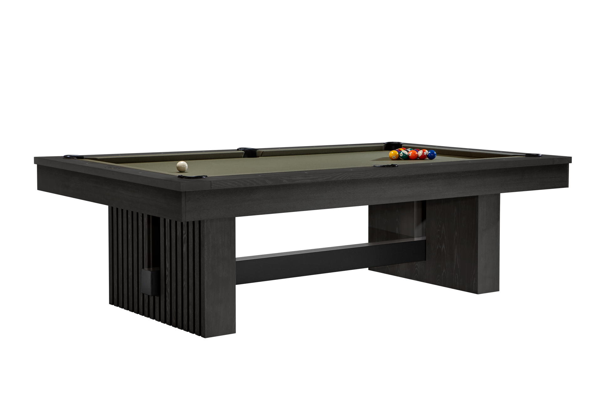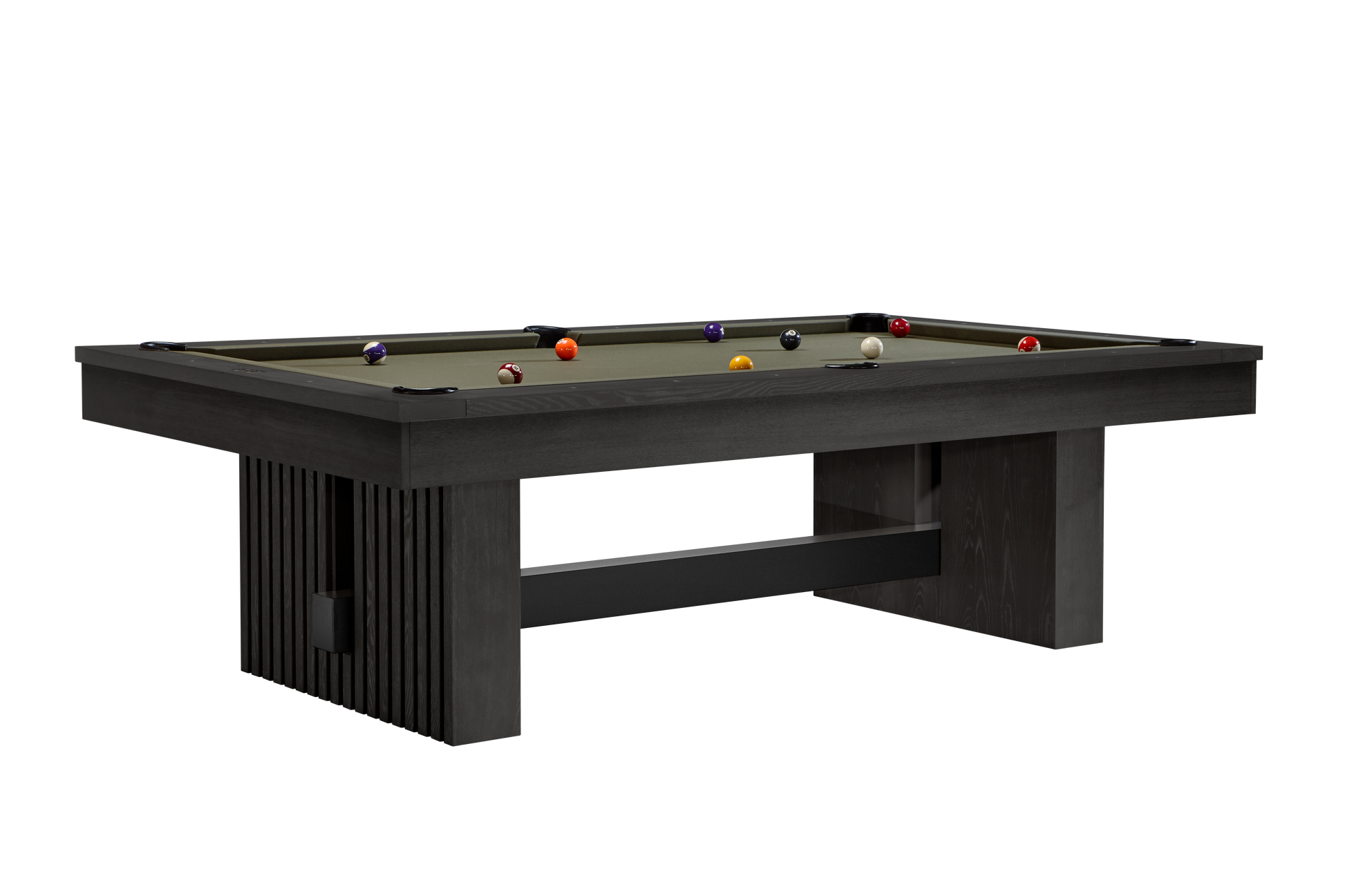 The Vancouver pool table features a modern mix of materials and textures highlighting its fresh and contemporary design. A wood batten-style base with a powder-coated metal beam completes the clean, organic aesthetic. Pair this billiard table with a dining conversion top for ultimate entertaining. This pool table features white pearlized diamond rail sights, robust construction, and internal drop pockets.